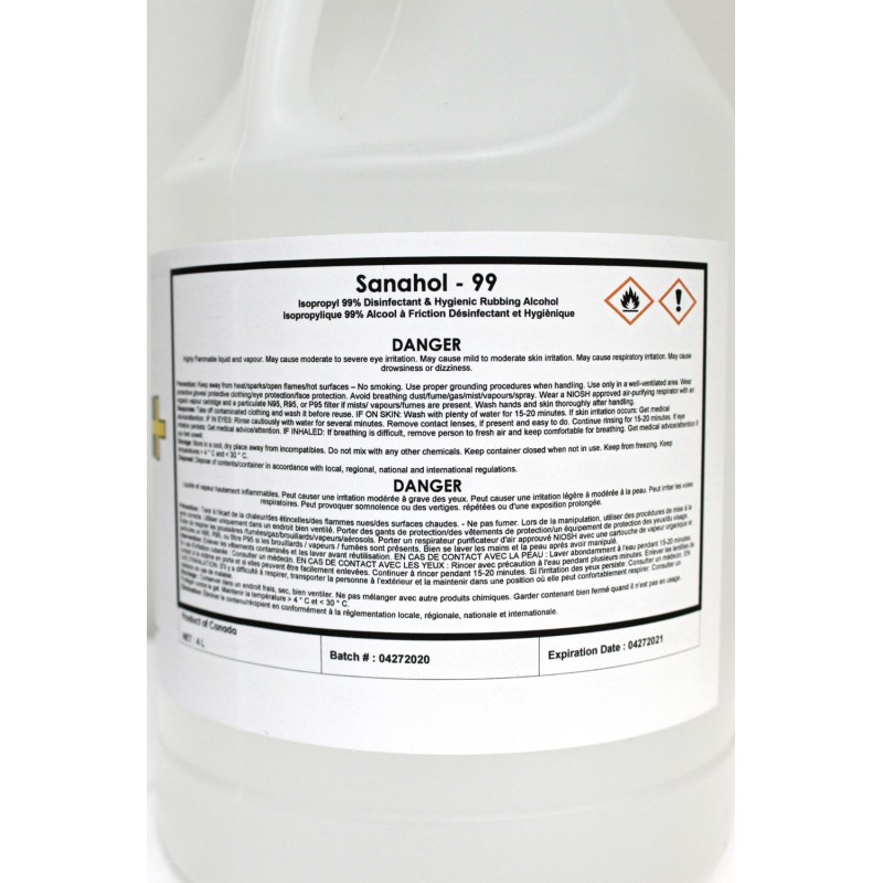 Sanahol-99+, an effective solvent, cleaner, sterilizer, disinfectant & hard surface sanitizer. When used as directed kills 99.9% microbial bacteria/germs, fungi & viruses including COVID, E-Coli and Influenza strains within 60 seconds of saturation. Not recommended for direct skin contact or use in the preparation of hand sanitizer or lotions. Not for use in Food Processing Plants.