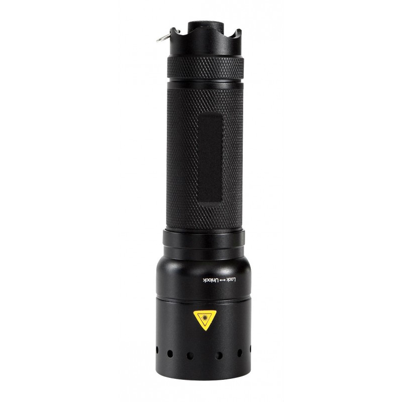 This torch emits 400 Lumen to illuminate to a distance of 240m. Mated to the internal micro-control processor, the rear tactical tap and set button allows the user to select the most suitable lighting option; High/Low/SOS or Strobe (full cycle). Operational sequence allows the user to choose and lock in one of three pre-programmed modes; Professional Mode: full cycle, Easy Mode: High/Low only, or Defensive Mode: High/Strobe only. Also features one handed speed focus that can be locked to secure spot or flood beam. Casing is crafted from aircraft grade anodized knurled black aluminum and ends are water and weather tight. Includes batteries, lanyard, and quick release swivel belt clip.