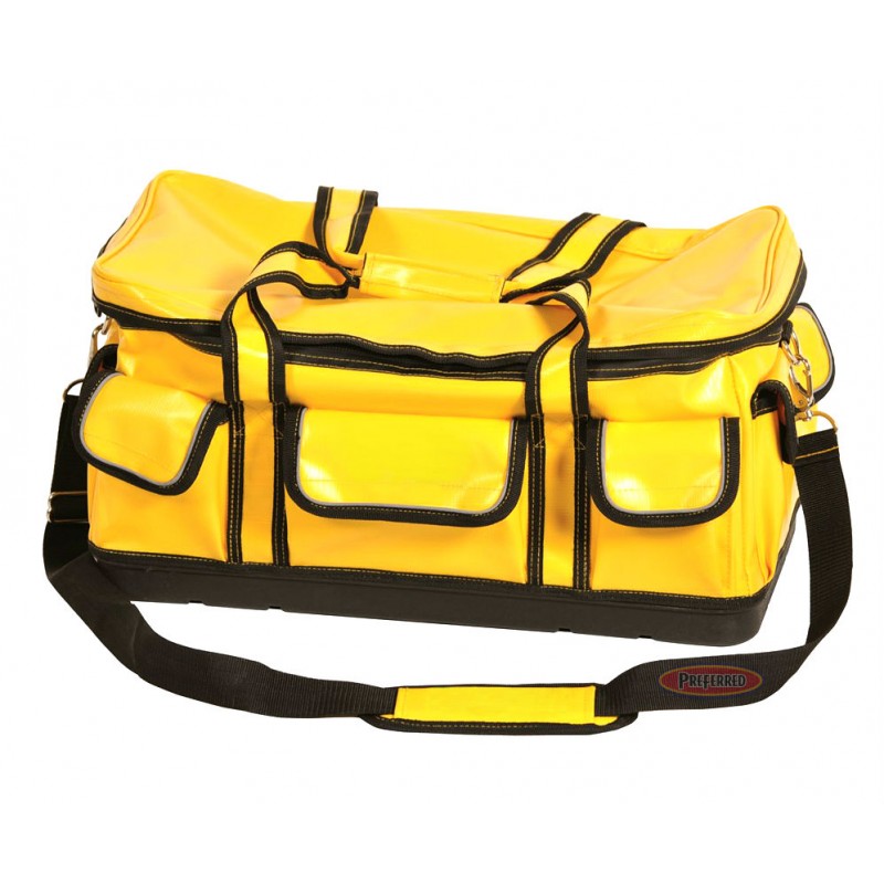 Protect tools, gear & high value equipment from damaging elements with this All Weather Professional Kit Bags. Durable & heavy duty skin made from 100% waterproof PolyVinyl. Reinforced, self supporting plastic base is solid, rigid & tough. Easy access weather protected overlap zipper lid comes with twin carry handles, adjustable padded shoulder strap & metal clasp ends.